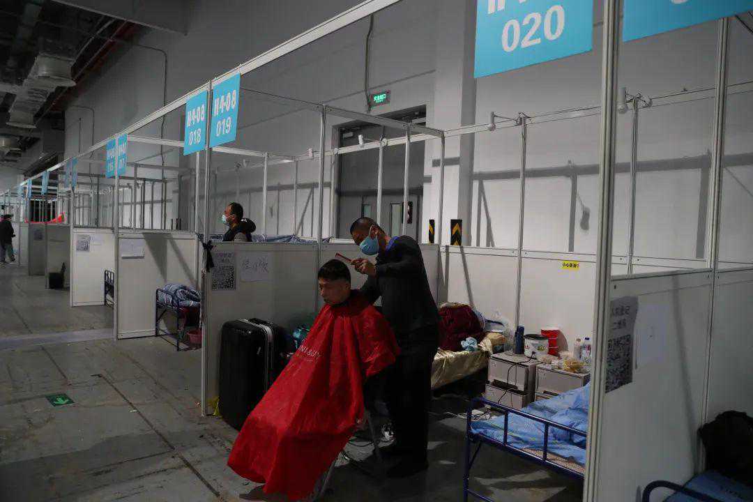 △上午10点04分,世博方舱的“托尼老师”陈师傅正在一位病友理发。